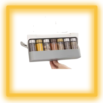 Facile à installer (sans perçage), il se fixe sous une étagère et se déplie vers le bas pour dévoiler 7 flacons pratiques et transparents, parfaits pour vos épices, graines ou condiments préférés.